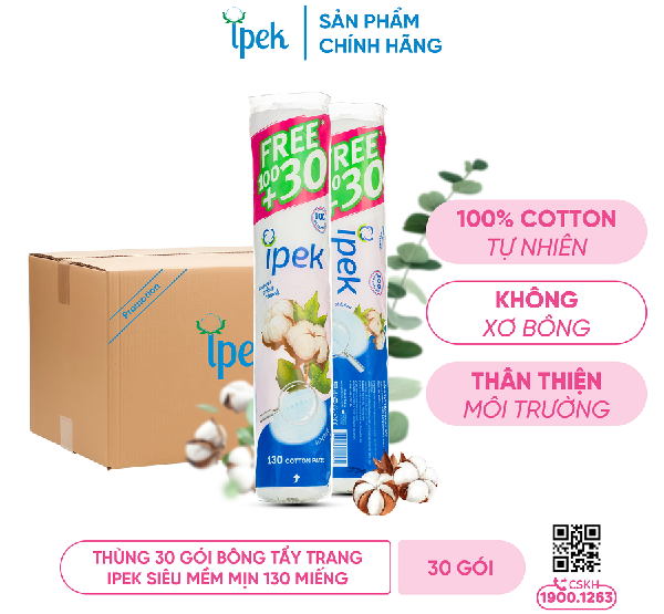 Thùng 30 gói bông tẩy trang Ipek siêu mềm mịn 130 miếng